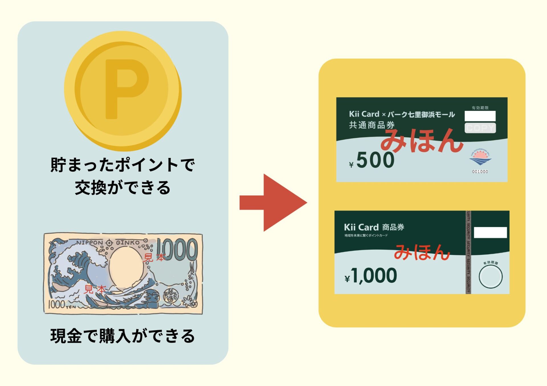 『Kii Card商品券』、『Kii Card×パーク七里御浜共通商品券』は、現金でご購入いただけます。