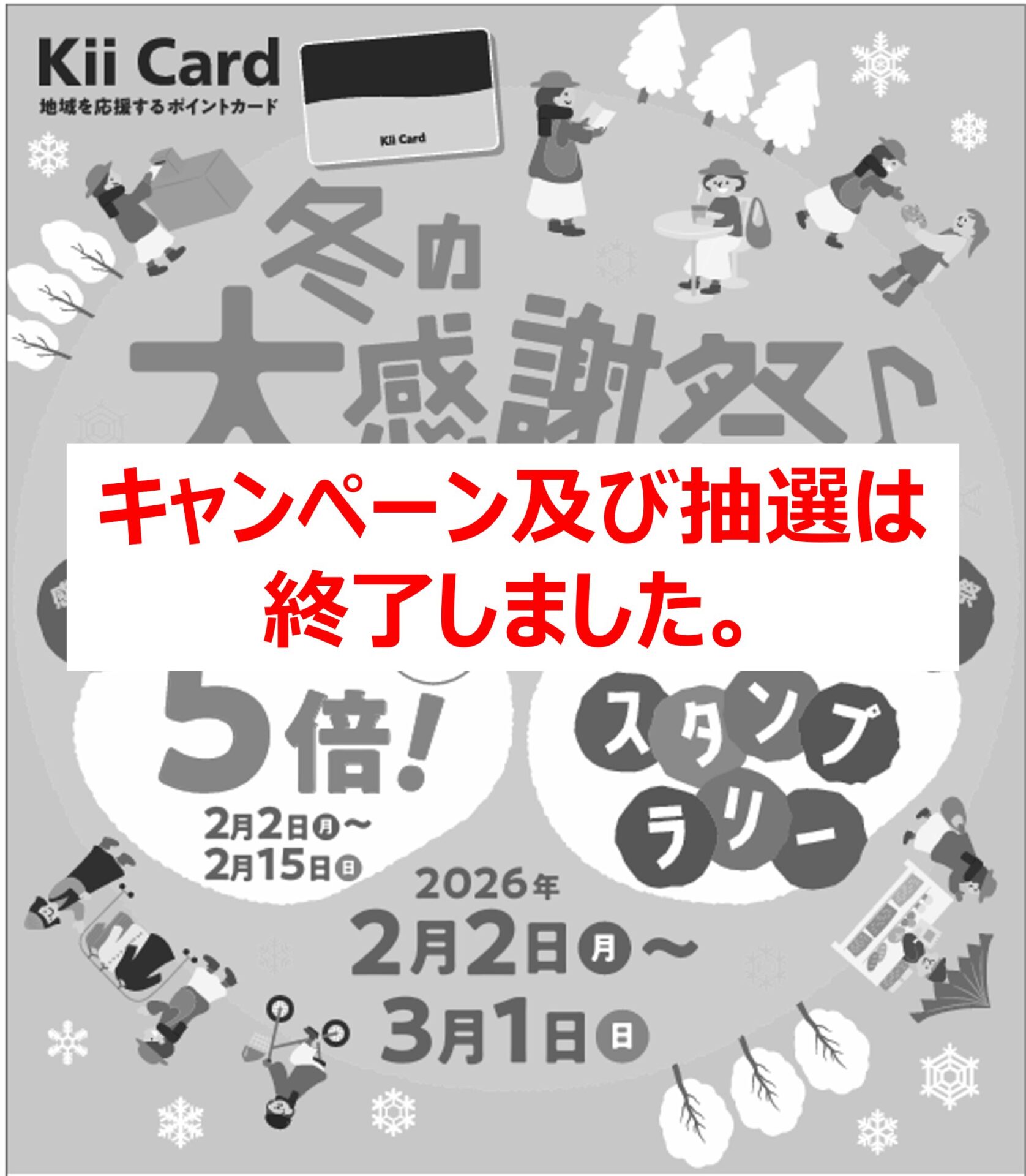 いつもKii Cardをご利用いただきまして、誠にありがとうございます。 2月2日~3月1日まで開催された「冬の大感謝祭 スランプラリー」の抽選が完了しました。 当選された方には、すでに当選通知を発送させていただきました。 今後ともKii Cardを末永くお引き立てくださいますよう、よろしくお願い致します。